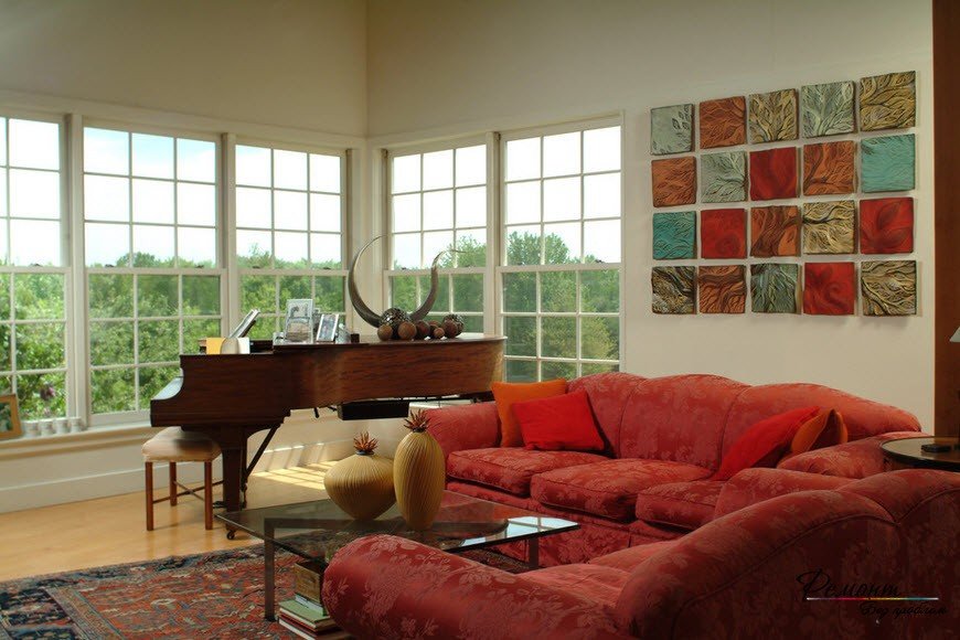 What will be your likely reaction when you enter this gorgeously styled living room? Our guess is that your jaws will simply drop! One can see a blend of many accessories here, but, the one feature that grabs you by surprise is the ceramic wall art pitched right behind the velvety red sofa. The wall art is handmade and is graffito carved. The colorful wall art blends seamlessly into the decor’s white color palette. The designer has also placed a wooden piano to bring back the feel of the 20’s.