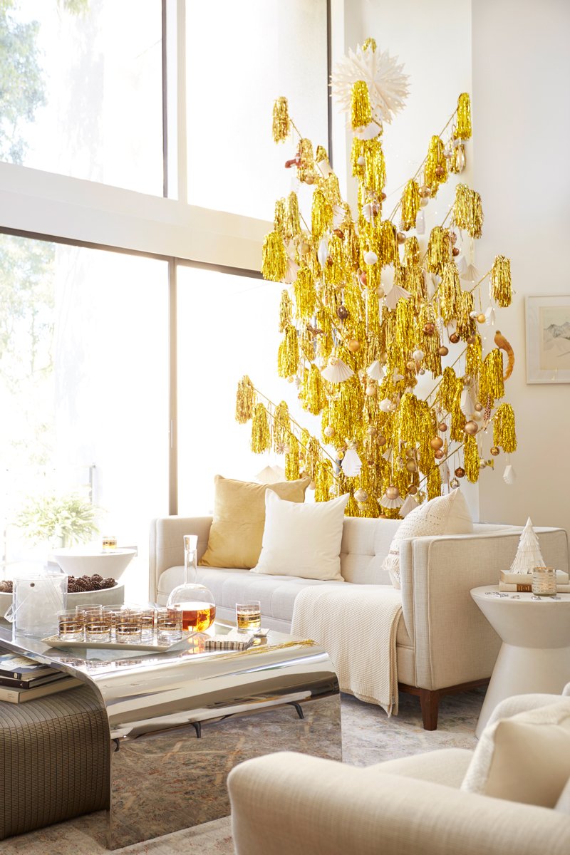 Xmas trees are used not only on Christmas, but are also used for celebrating New Year’s Eve party. If you wish to do something different this year, then make use of your Xmas tree and deck it up in any way that you like. In the image here, the white living room gets a transformation with a gigantic golden tree becoming the main centerpiece of its decor. Its decked up with plenty of ornaments that integrate nicely with the rest of the accessories.